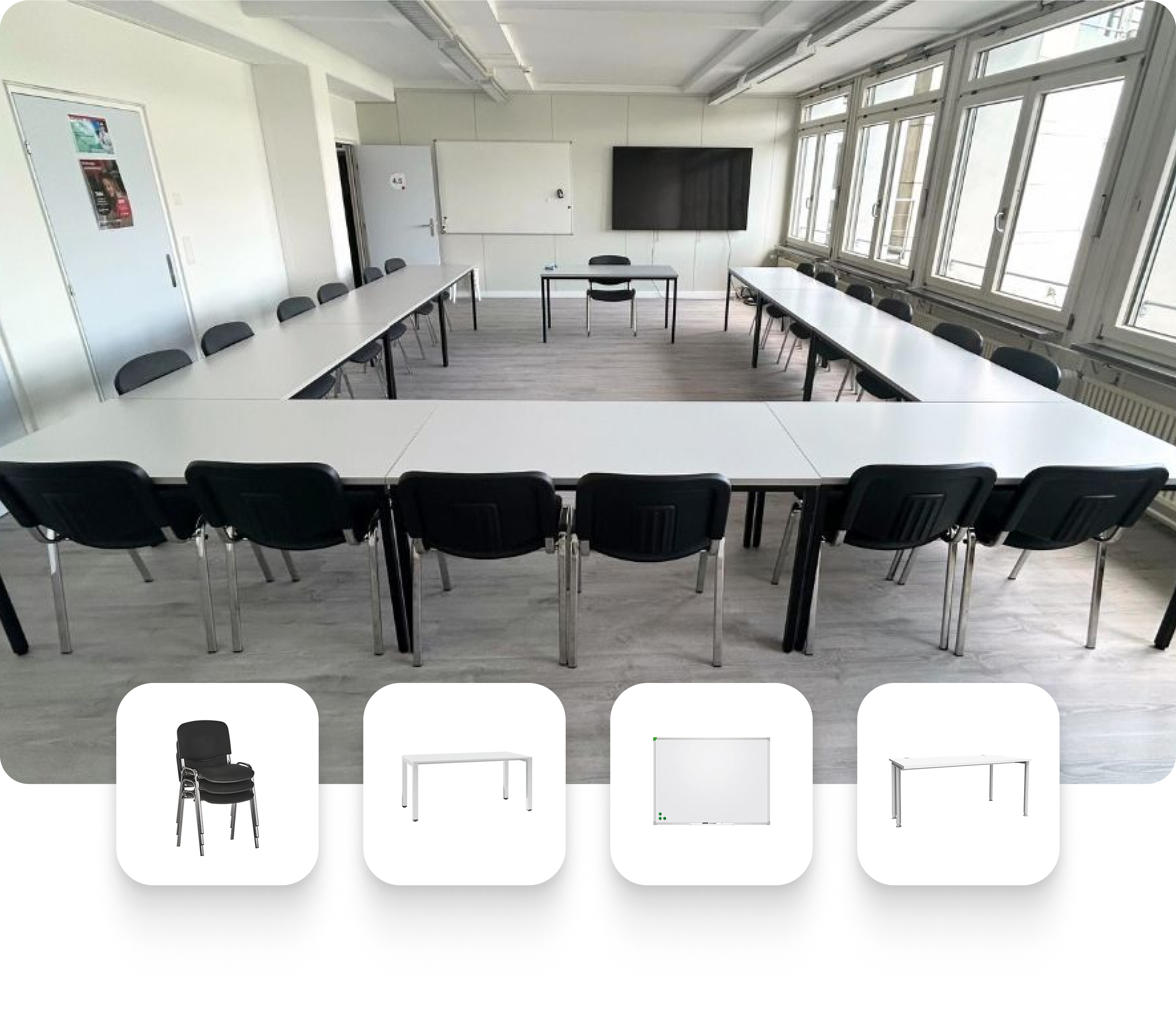The wider, light-toned desks give students plenty of room for textbooks, laptops and notes. Since tables and chairs are feather-light, the room can switch from classic rows to group clusters or exam layouts in minutes.