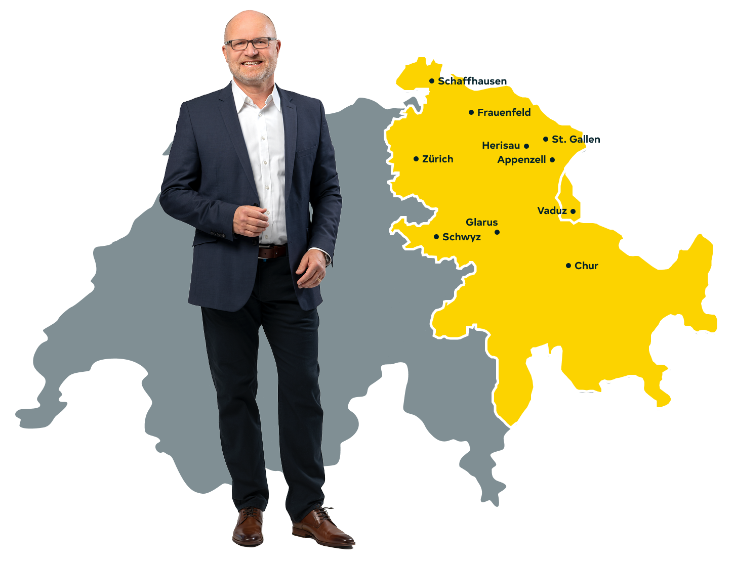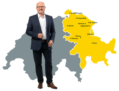 L’expert en aménagement de bureau Oliver Egli se fera un plaisir de vous conseiller et de vous rendre visite dans les cantons de Zurich, Schwytz, Glaris, Saint-Gall, Thurgovie, Appenzell Rhodes-Intérieures, Appenzell Rhodes-Extérieures, Schaffhouse et Grisons, ainsi qu’au Liechtenstein.