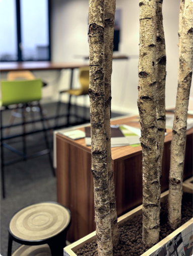 Con elementi di design studiati, come una carta da parati atmosferica e tronchi d'albero come punto focale, abbiamo creato uno spazio che si distingue dalle sale riunioni tradizionali.